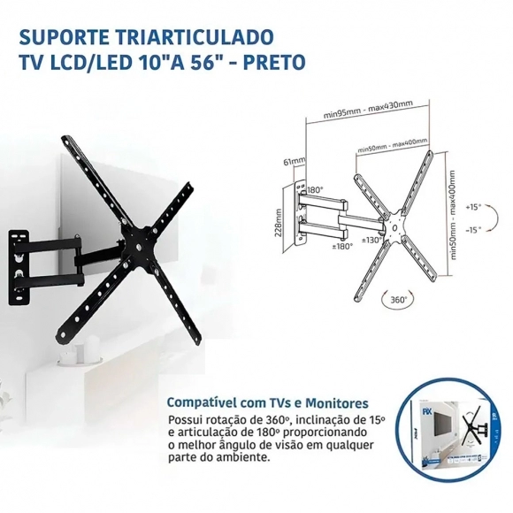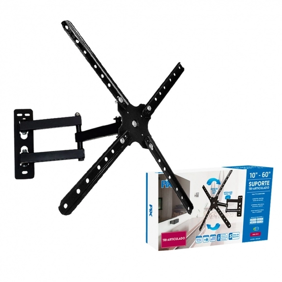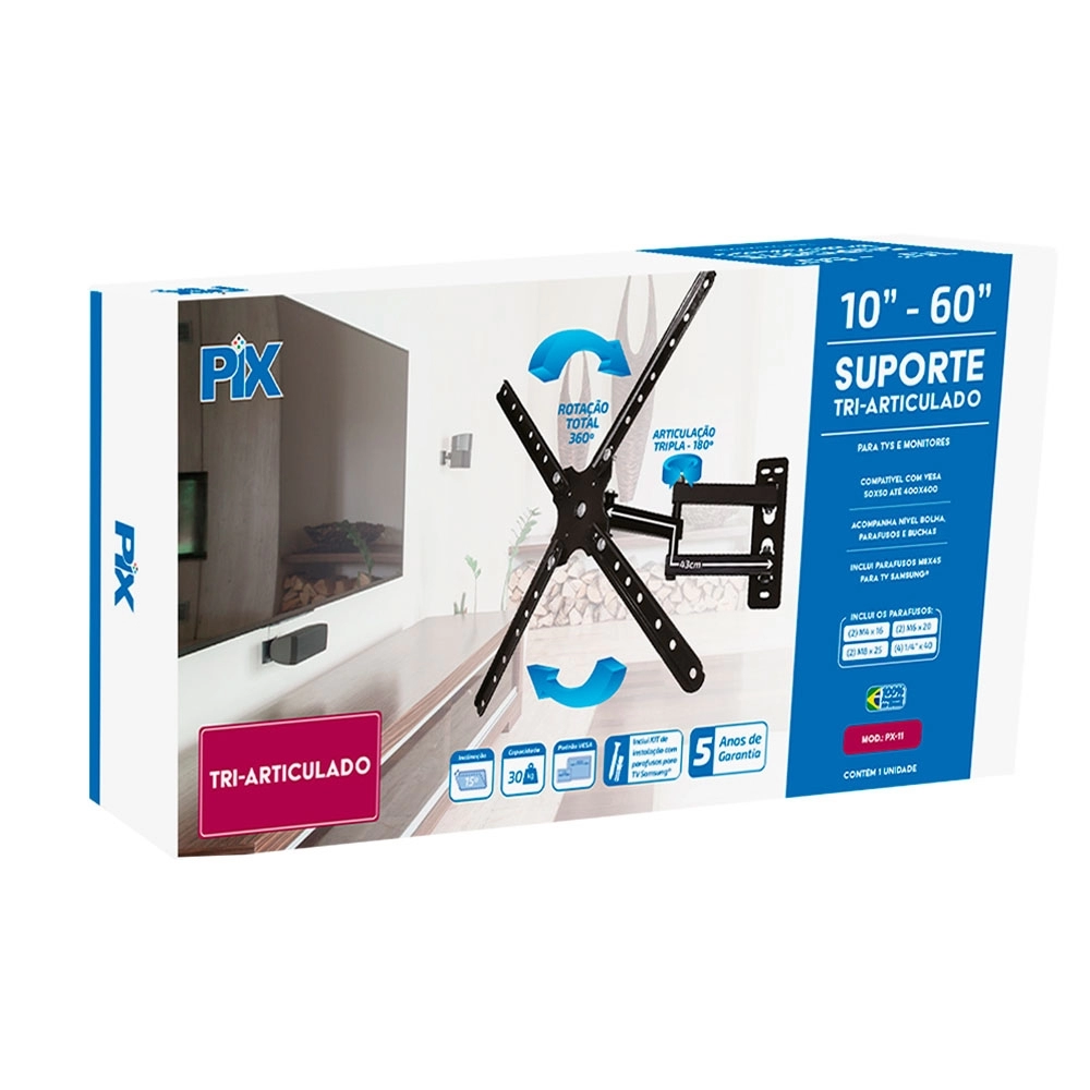 Otimizar espaço sem perder o melhor que seu aparelho de TV pode oferecer é fundamental na organização do seu ambiente. Seja na sala, no quarto ou, até mesmo, no escritório, o suporte tri-articulado PIX suporta TVs e monitores com até 30 kg, é compatível com TVs de 10” a 60”, além de possuir rotação de 360º, inclinação de 15º e articulação de 180º proporcionando o melhor ângulo de visão em qualquer parte do ambiente.